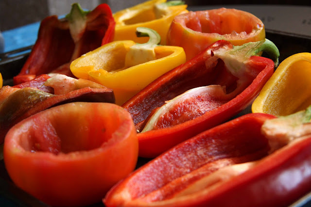 pimientos vaciados. Encima de los tomates, colocamos de nuevo las tapaderas que