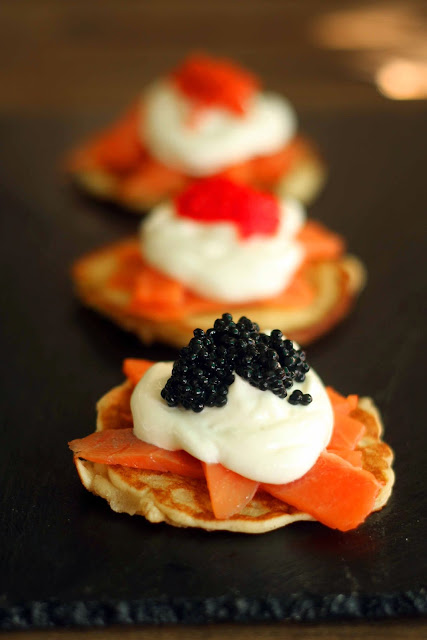 BLINIS CASEROS CON SALMÓN, CREMA AGRIA Y "CAVIAR"