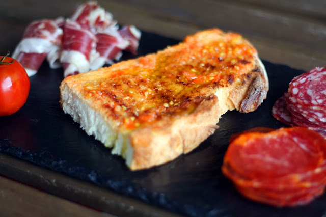 Así que, como estuve en el precioso Mercado de la Boquería, hoy, para celebrarlo, desayunamos Pa amb tomàquet... con su pan del payés recién tostadito (sólo por una cara de la rebanada), sus tomatitos de los que se cuelgan bien restregaditos(que al perder agua y concentrar su sabor resultan más que deliciosos), su generosísimo chorrito de aceite de oliva virgen extra, su pizquita de sal y unos maravillosos embutidos de acompañamiento.